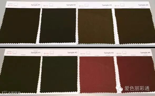 此图显示在 U30 荧光灯(上方)和 A 白炽灯(下方)光源下同样染色的羊毛布样。注意到样品看来似乎变了颜色? 这当然是制造商想要避免的情况。同色异谱匹配相当普遍,尤其是近中性的颜色,如灰、白以及类似这些的暗色调。随着颜色变浅或变得更饱和,可能的同色异谱匹配范围变小。