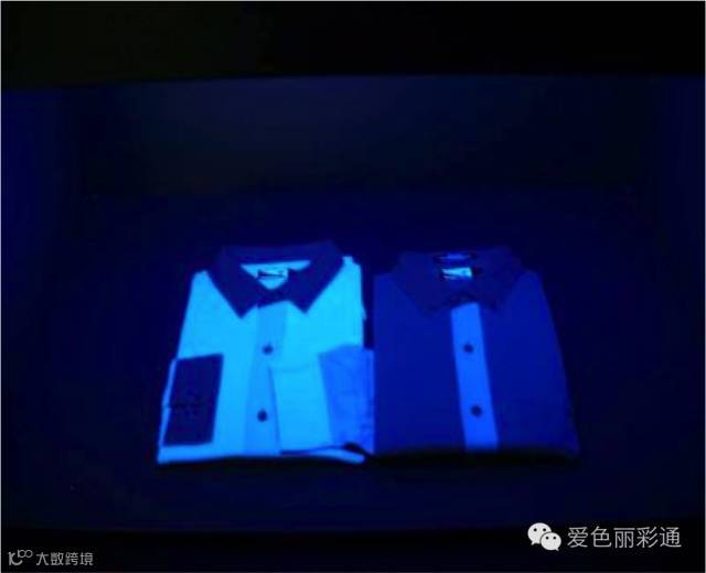 虽然这些衬衫颜色在日光下看来匹配,但是换成紫外光后,就能看到衬衫各个部分实际上是同色异谱对。