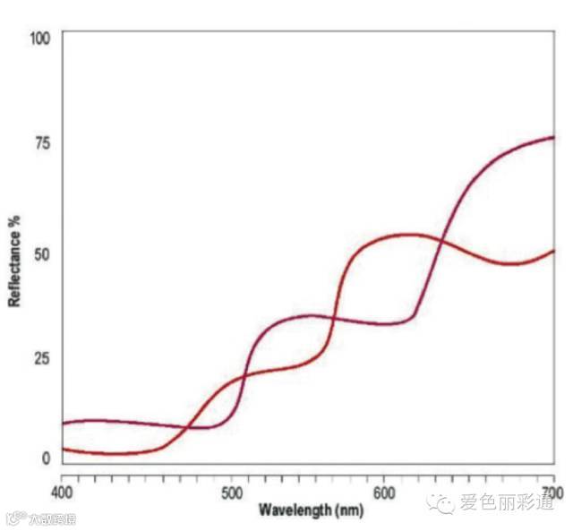 上图显示了两种红色的反射曲线。两条曲线都强烈吸收蓝色,都适度地吸收绿色,都相当强地反射红色。注意到两条曲线在相互之间扭曲? 当两个物理样本之间有至少三次交叉,它们就是同色异谱对。如果物体是同色异谱对,同色异谱现象显而易见;而且,尽管有时似乎是相同的颜色,但它们不会在所有照明条件下都匹配。