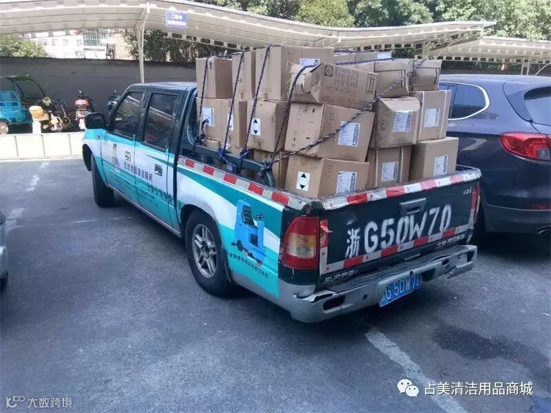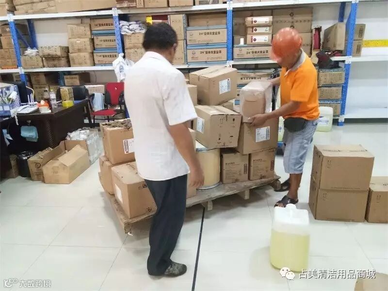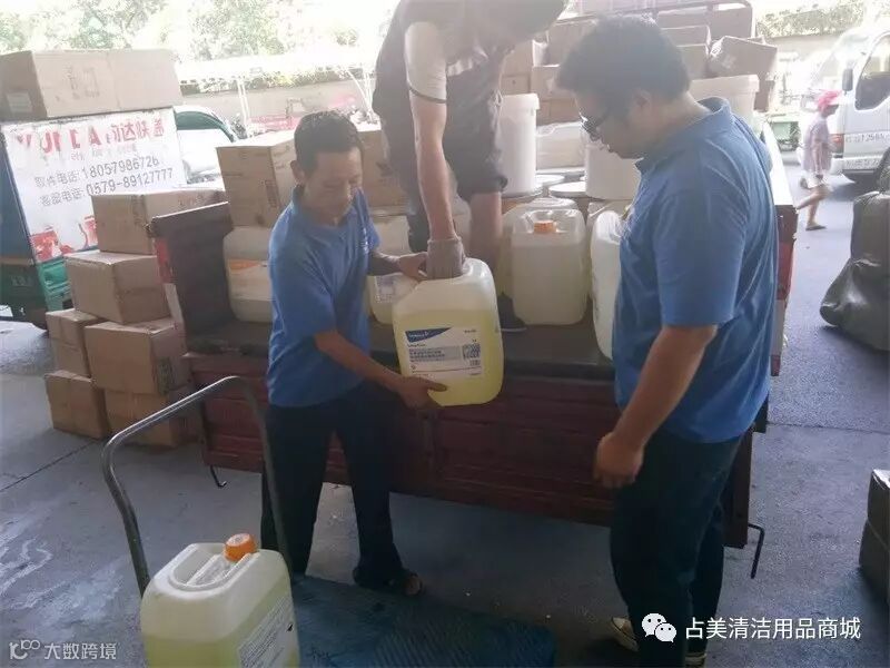 我们占美公司的同事和司机师傅同心协力帮忙搬这些高端的清洁剂。