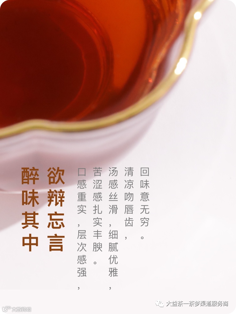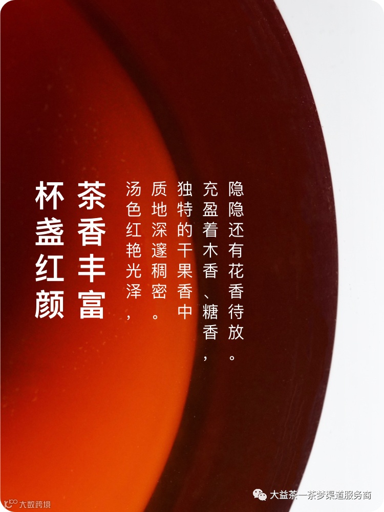 汤色深邃迷人,汤中含香,糖香与干果香沁润交融,汤质如米汤般稠滑饱满,口感重实,表现为苦涩感的茶单宁扎实丰腴,杯底香馥郁持久;