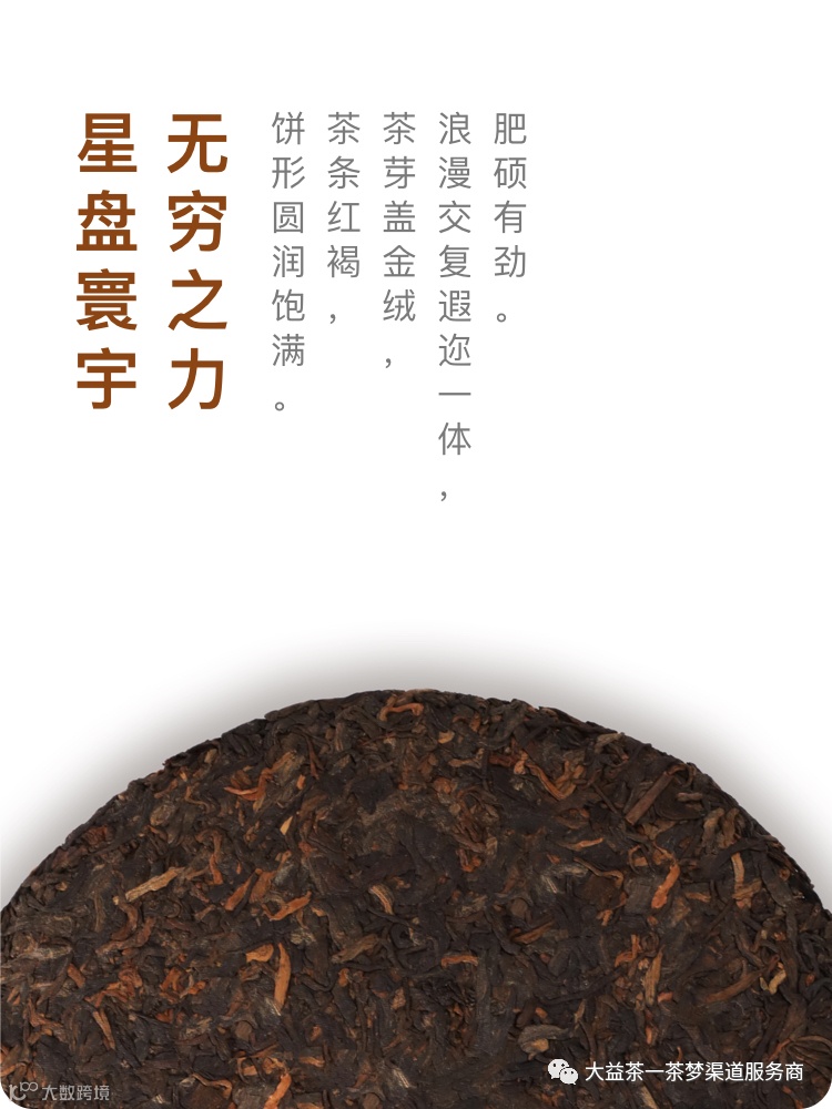 原料:精选布朗山核心产区古树茶原料,经入选国家级非物质文化遗产名录的“大益茶制作技艺”发酵、拼配特制而成。