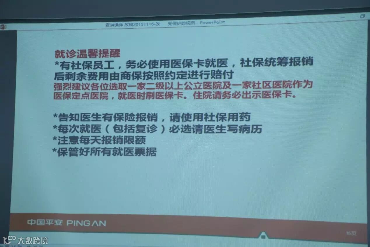 宣讲会主要向各个部门代表介绍了2017-2018年平安商业保险理赔的方案及投保流程,并分享了意外险的一些理赔案例,同时在现场直接对各部门提出的疑问进行答疑。如果你错过了本次宣讲会,可以从部门代表或者人力资源行政部进行了解,更多资料及资讯可访问公司共享盘