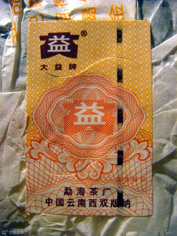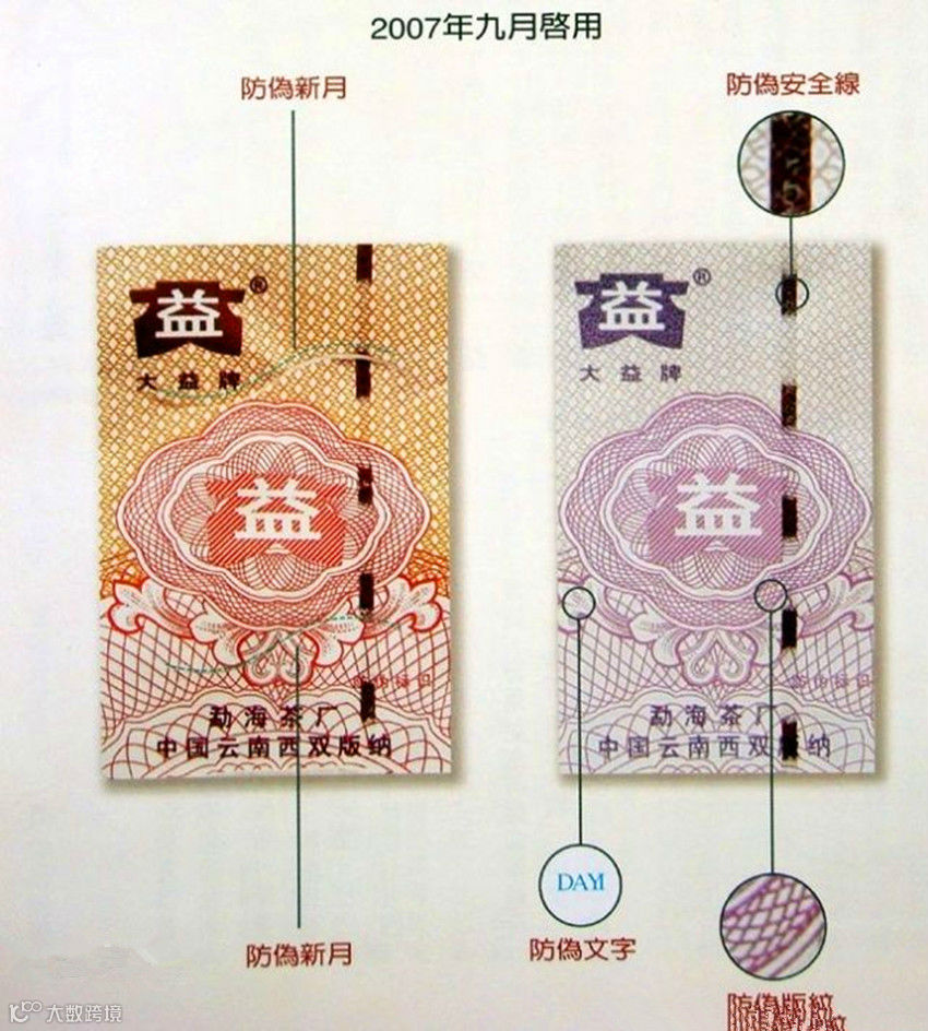 简单的鉴别方法,用肉眼观察就可分辩防伪:内飞及标签上均有一根深棕色的线在纸上时隐时现,线上印有激光缩微文字“大益”,微缩字母“DAYI”在特定位置通过放大镜亦清晰可见,满足以上条件即为大益真品。