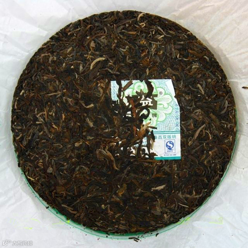 因此,也有绿色“茶”字的茶品被称为“黄印”,不足为怪。“黄印”系统的产品,由于很多都没有唛号,结合茶品的转化程度,推测其年代早于有唛号的产品。其外包装为大口中印刷,内飞细字尖出。“大蓝印”也是早期勐海茶厂的青饼,其年代与黄印系统接近。