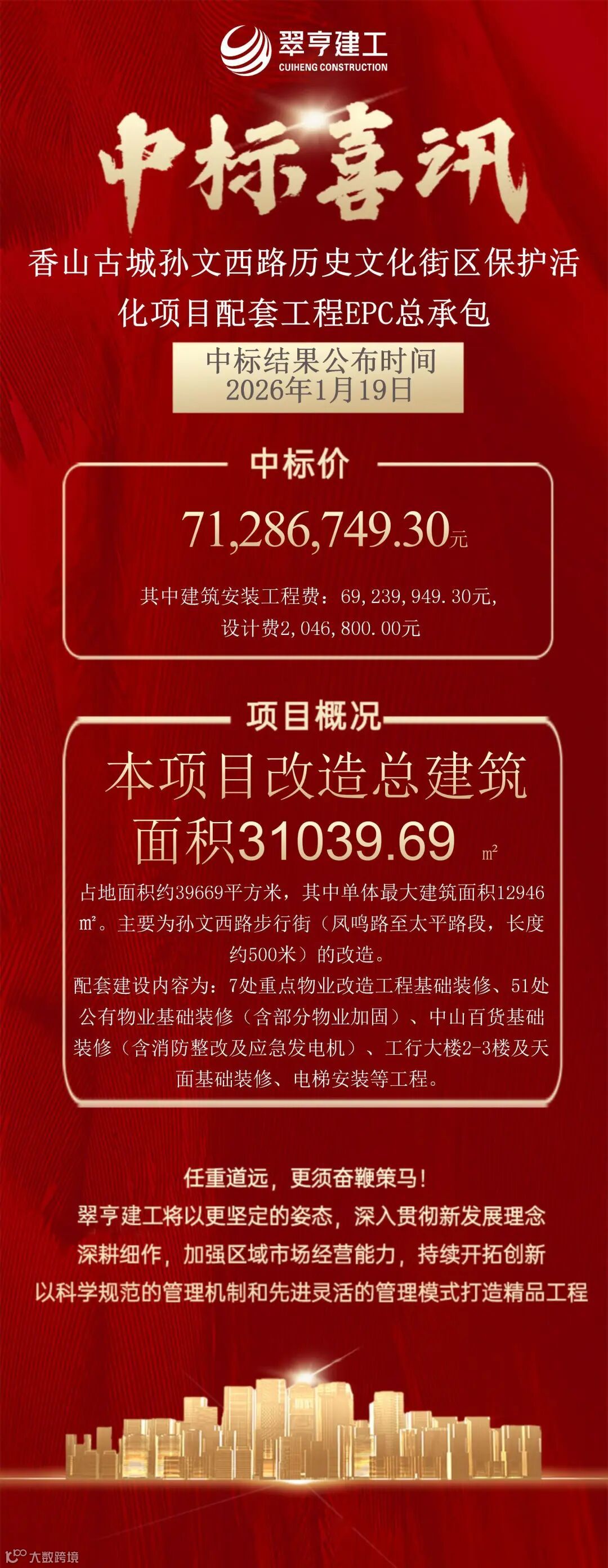 1月19日,翠亨建工成功中标“香山古城孙文西路历史文化街区保护活化项目配套工程EPC总承包”项目,中标金额7128.67万元。该项目改造总建筑面积约3.1万平方米,重点对孙文西路步行街段进行系统性修缮与活化,涵盖多处历史建筑改造、结构加固及整体功能提升。