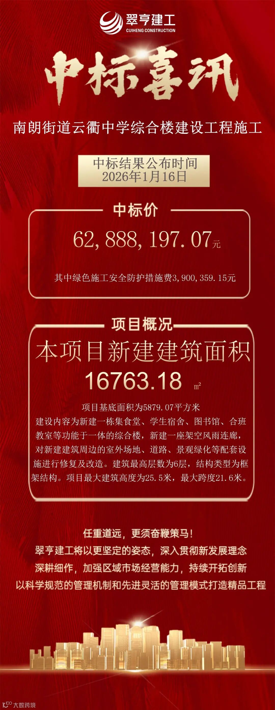 1月16日,“南朗街道云衢中学综合楼建设工程施工”项目定标结果揭晓,翠亨建工凭借出色的综合实力与良好的市场声誉,以6288.82万元成功中标。