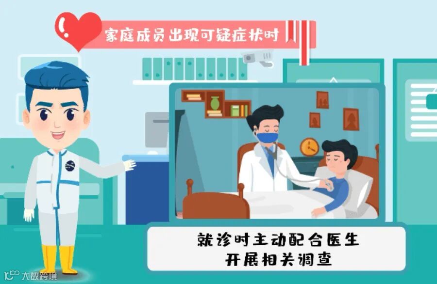 (1)及时就医:若家庭成员出现发热、干咳、乏力、鼻塞、流涕、咽痛、嗅觉味觉减退、结膜炎、肌痛和腹泻等症状,应及时到附近发热门诊就诊。并主动告知14天的活动轨迹及接触史,就医途中全程佩戴口罩,避免乘坐公共交通工具。就诊时主动配合医生,开展相关调查。