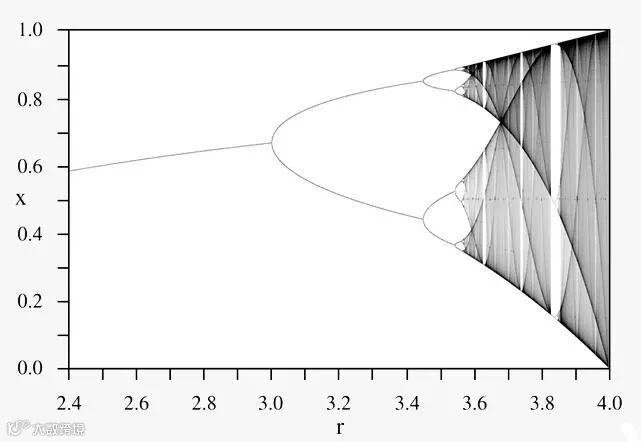 一切都保持稳定的状态,直到我们达到了“三倍”的增长率(r=3)时,奇怪的事情发生了:平缓的人口增长曲线开始在两个不同的状态:“繁荣与萧条”之间波动震荡。当增长率达到3.4495时,曲线开始在四个不同的状态之间波动。当增长率达到3.596时,人口数量在16个不同状态之间快速波动。增长率再稍微高一点,便进入混乱状态。