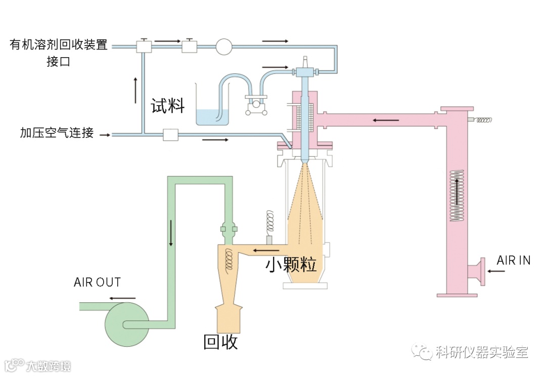 将原料溶液通过喷嘴以极细液滴的形态喷入干燥室,在干燥室中遇到热风气流迅速蒸发其中的溶剂,将溶质的小颗粒通过旋风分离器回收。
