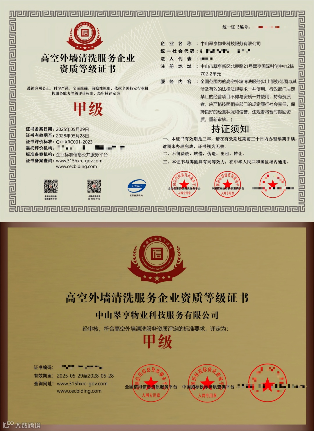 为深入践行高质量发展要求、积极拓展多元化经营服务能力,近期,翠亨集团所属中山翠亨物业科技服务有限公司(以下简称“翠亨物业”)成功取得高空外墙清洗专业资质甲级证书,标志着翠亨物业已具备为各类中高层建筑提供安全、规范、高效外墙清洗服务的专业能力。
