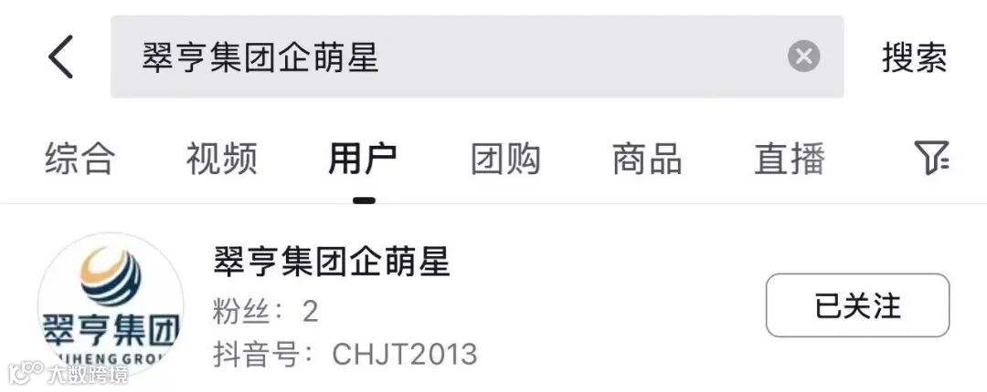 打开抖音app,在【抖音搜索栏】中输入用户名称:翠亨集团企萌星,或者直接搜索抖音号:CHJT2013