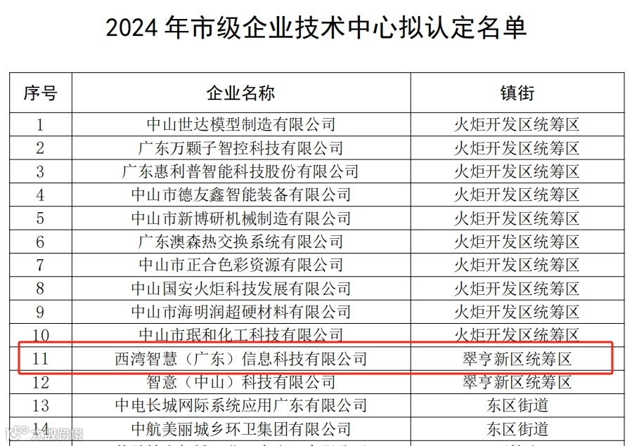西湾智慧公司被认定为市级企业技术中心。