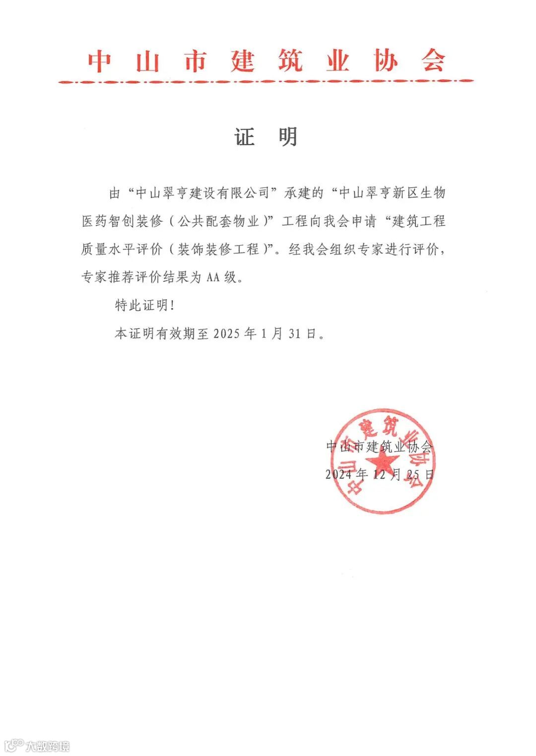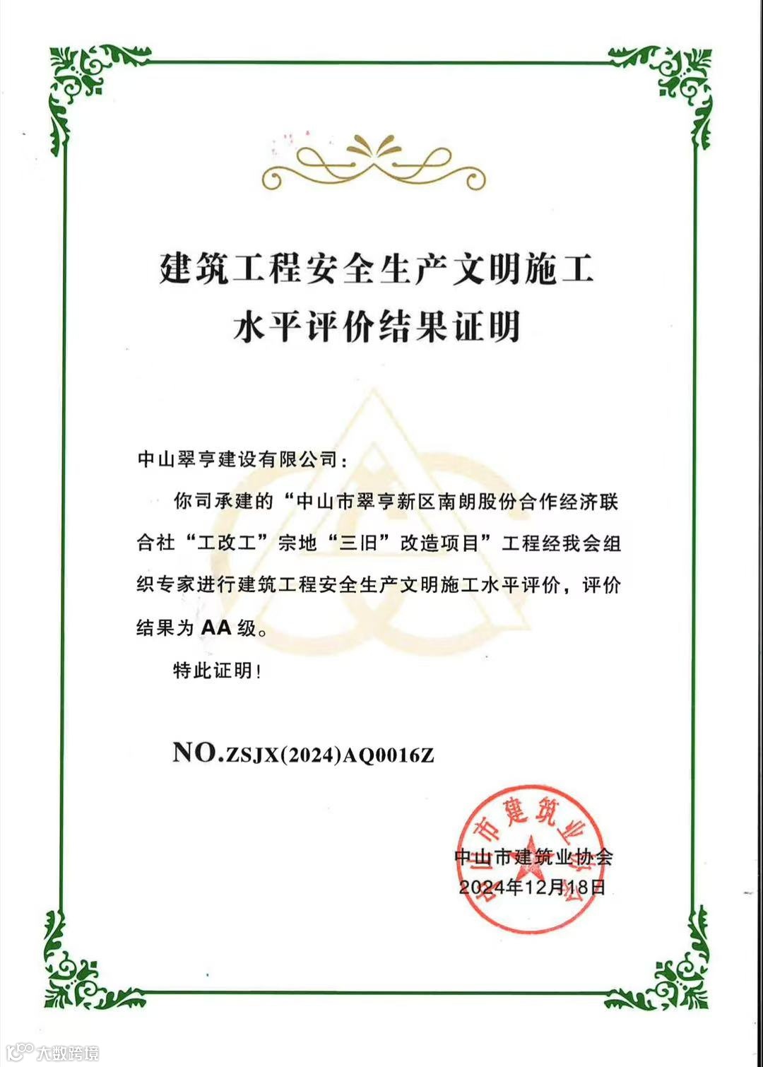 翠亨建工承建的“三旧”改造项目获得建筑工程安全生产文明施工水平评价AA级、质量水平评价AA级;智创项目获得建筑工程质量水平评价(装饰装修工程)AA级。