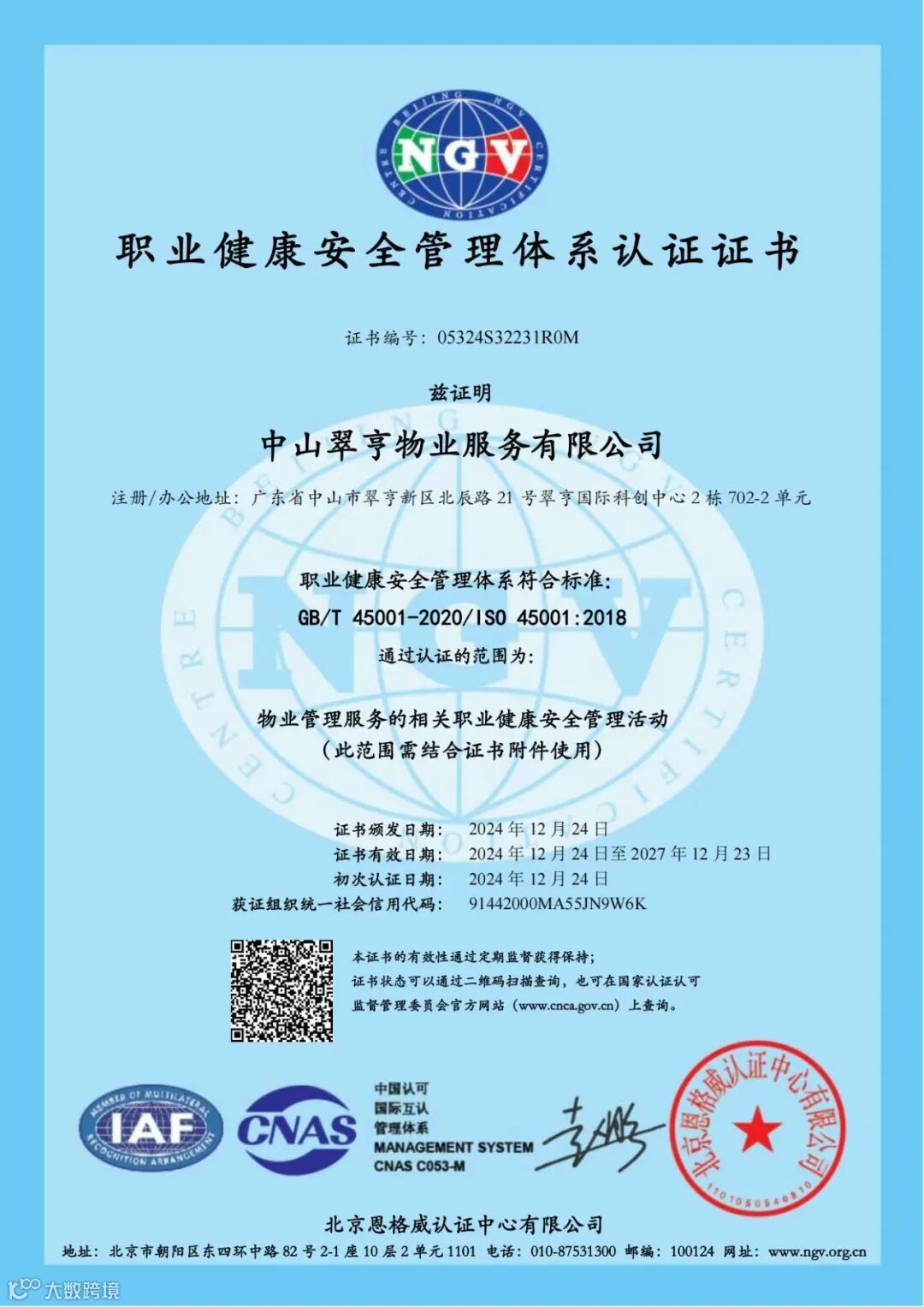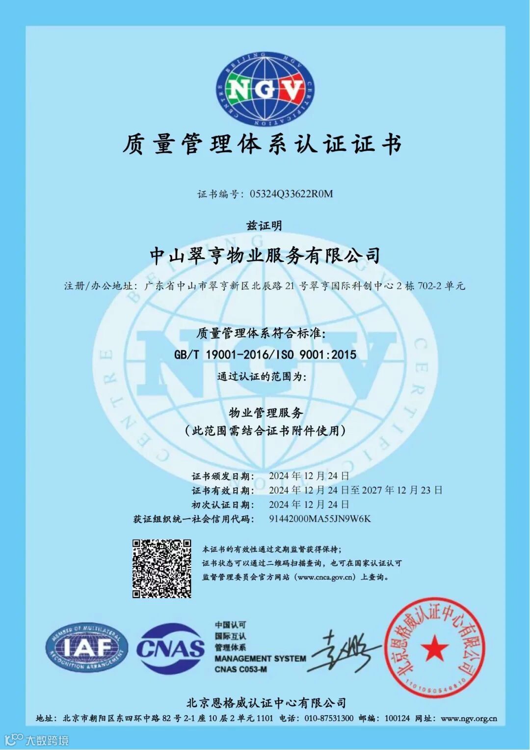 翠亨物业公司顺利通过ISO9001质量管理体系、ISO14001环境管理体系及ISO45001职业健康安全管理体系认证。