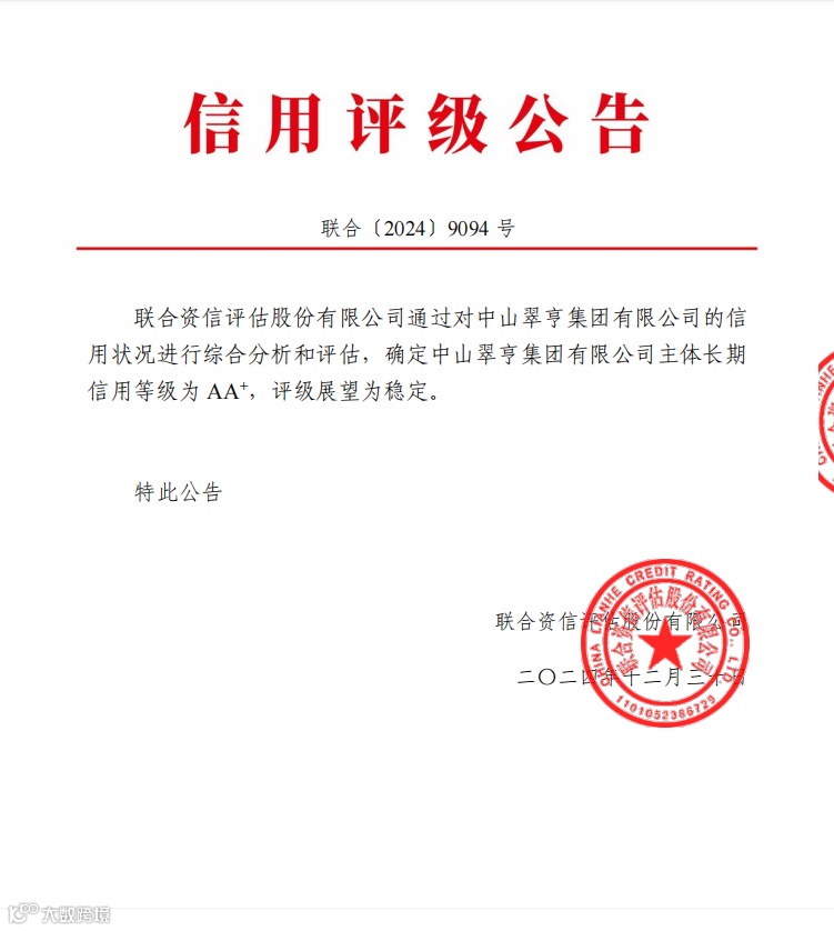 2024年12月30日,经联合资信评估股份有限公司综合分析和评估,确定中山翠亨集团有限公司主体长期信用等级为“ AA+ ”评级,展望为稳定