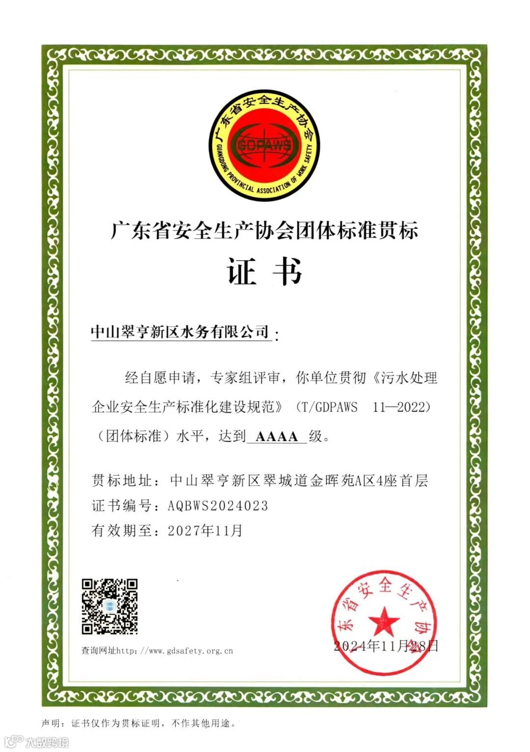 水务公司成功获评安全生产标准化管理体系贯标等级AAAA级认证。