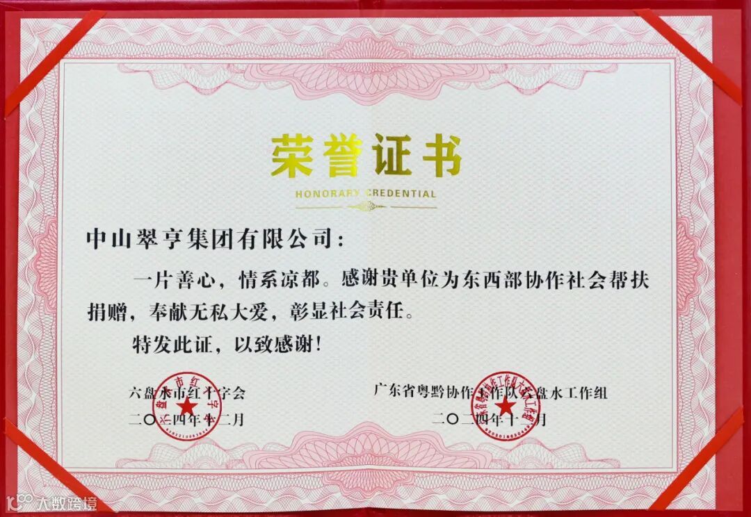 此外,获得广东省粤黔协作工作队六盘水工作组颁发的证书,感谢集团奉献无私大爱,彰显社会责任。