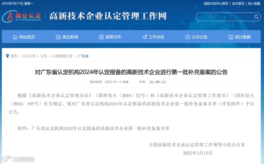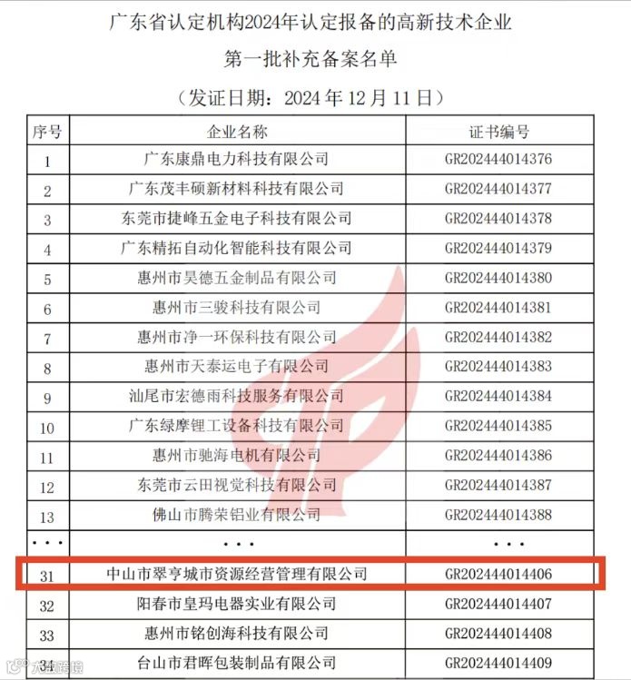 3月13日,在高新技术企业认定管理工作网《对广东省认定机构2024年认定报备的高新技术企业进行第一批补充备案的公示》中,城资公司凭借科技创新能力与研发成果成功入选,标志着企业正式跻身国家级高新技术企业行列。