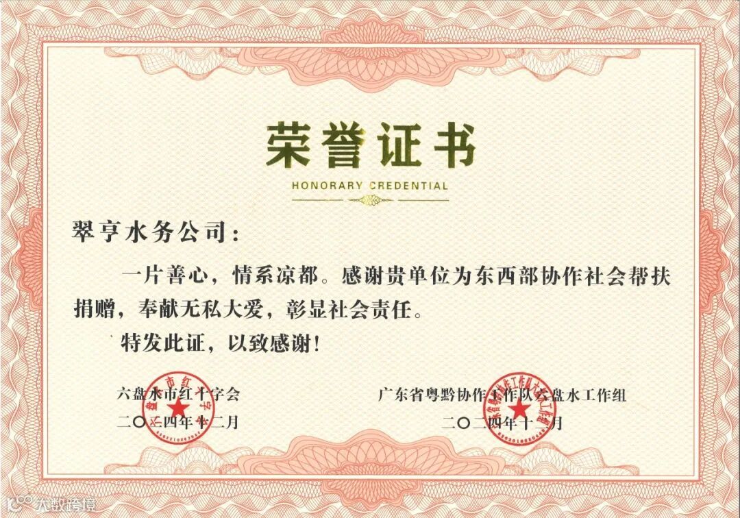 12月18日,水务公司获得广东省粤黔协作工作队六盘水工作组颁发的荣誉证书,感谢水务公司在东西部协作社会帮扶工作中的贡献。