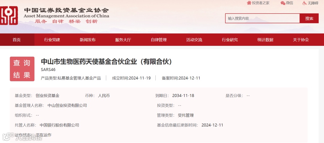 近日,中山市生物医药天使基金合伙企业(有限合伙)在中国证券投资基金业协会完成基金备案,正式设立。该基金是中山国资国企首只生物医药天使基金,也是中山国资国企规模最大的一只生物医药基金,总规模10亿元。