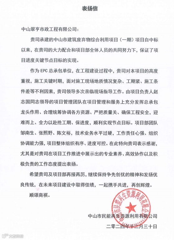 1月3日,翠亨建工公司收到了来自业主-民能再生资源利用有限公司的表扬信。