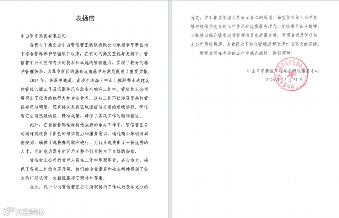 12月31日,西湾信息公司下属管信智汇公司收到新区工程项目建设事务中心表扬信。
