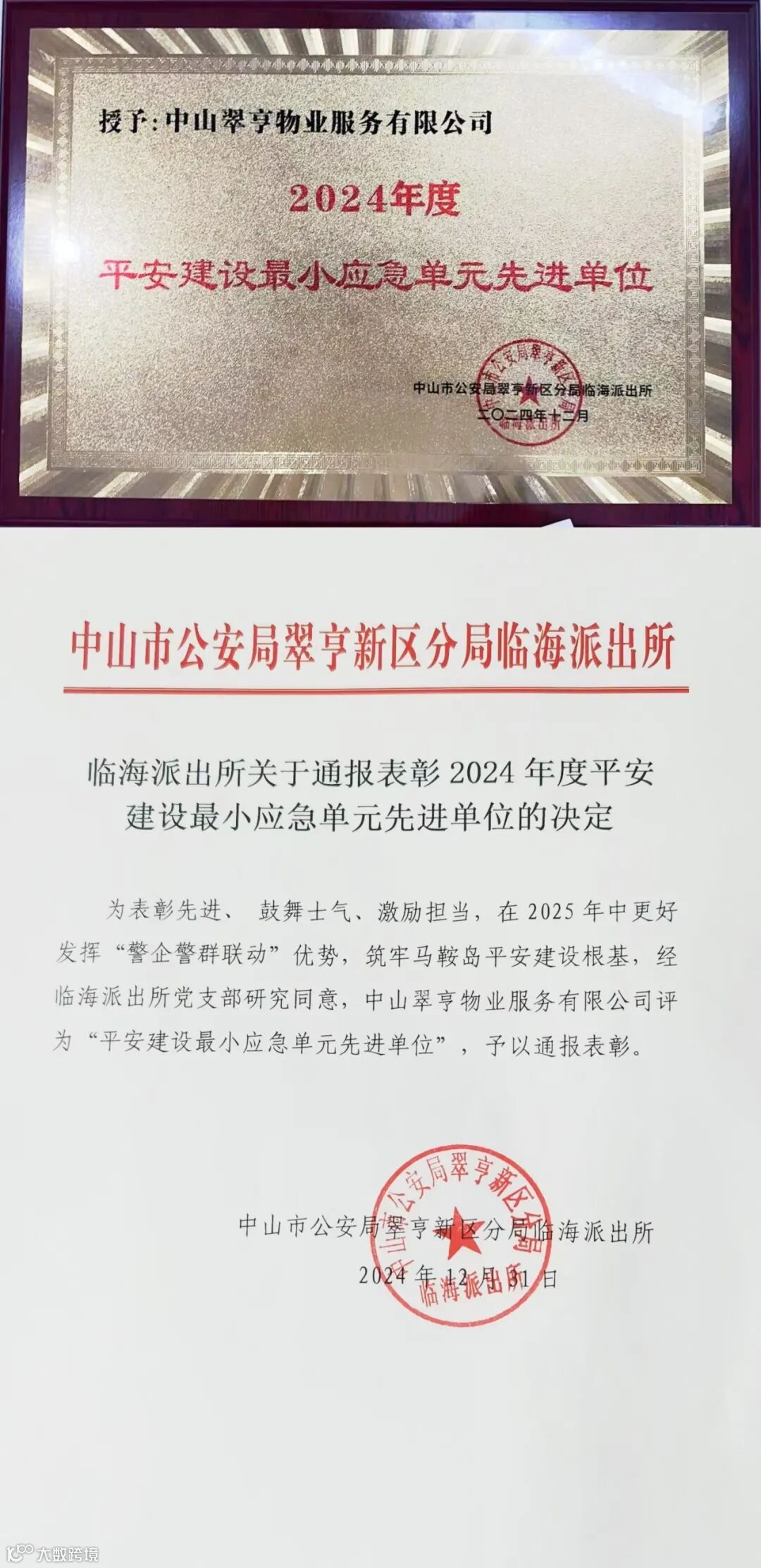 12月31日,翠亨物业公司收到中山市公安局翠亨新区分局临海派出所颁发了“2024年度平安建设最小应急单元先进单位”的光荣奖牌。
