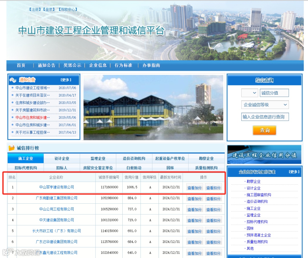 1月1日,在最新发布的中山市建设工程企业管理和诚信平台上,翠亨建工公司位列第一。