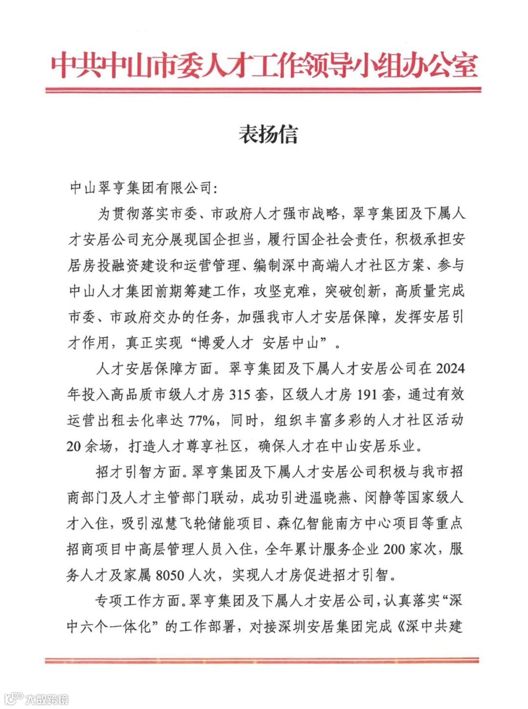12月31日,人才安居公司收到市委人才办表扬信。