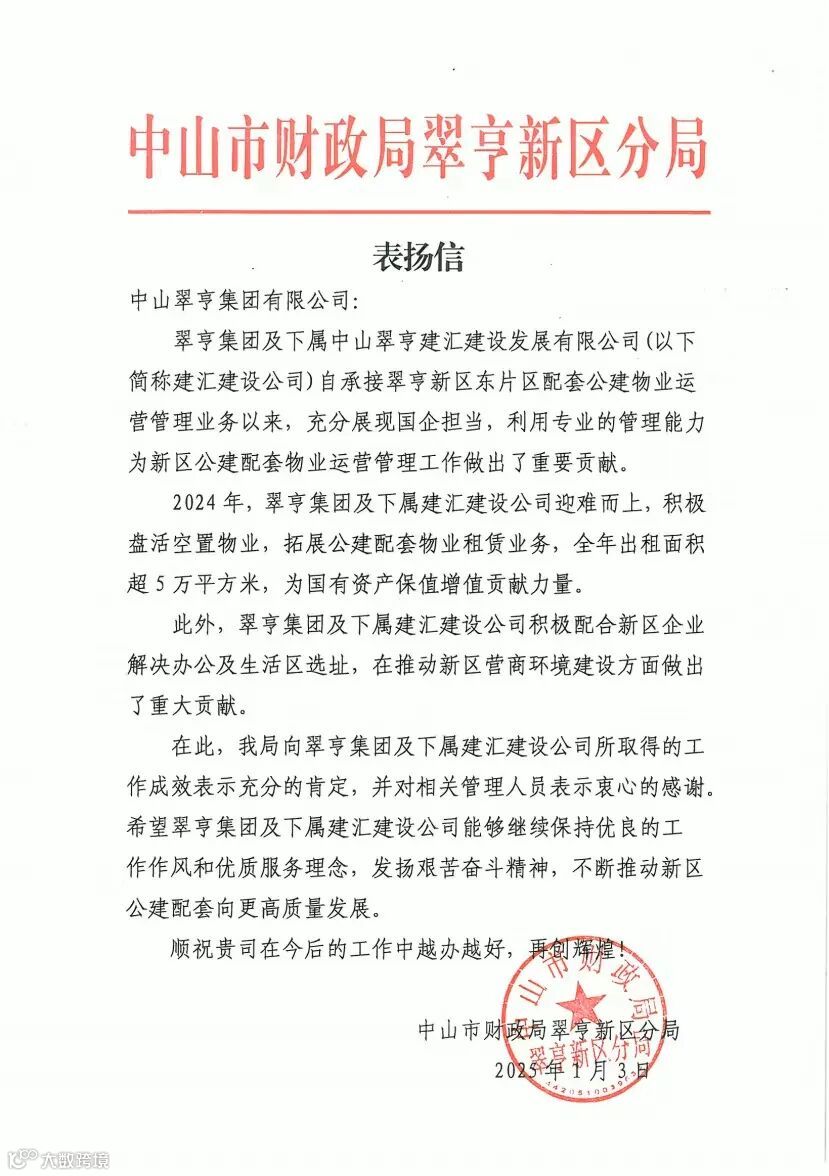 1月3日,人才安居公司收到市财政局翠亨新区分局表扬信。