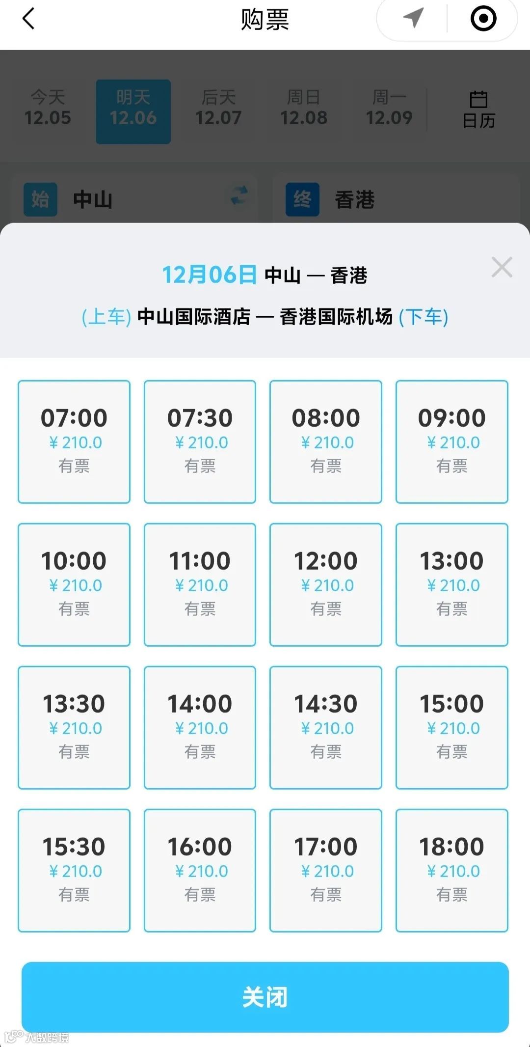 在“深港荣利”微信小程序可以看到,从中山国际酒店出发前往香港国际机场的线路,每日首班于7:00发出,末班于18:00发出,全天共16班次。