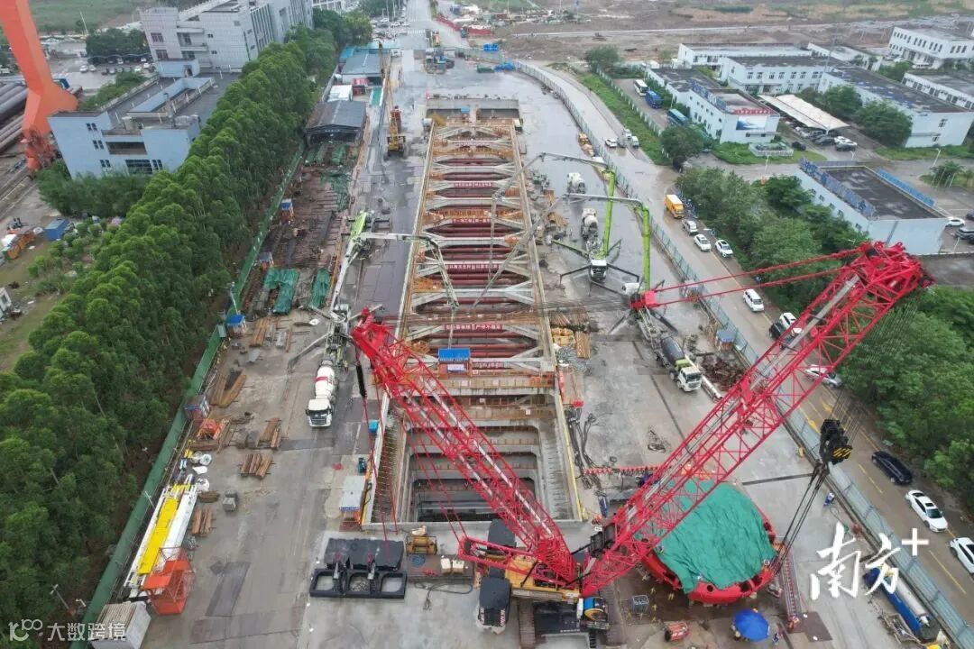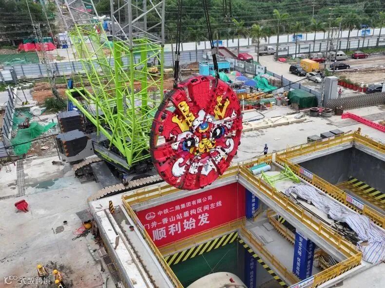 5月9日,南中城际横门井工点,南中城际中山段首台盾构机的刀盘顺利完成吊装,与井下的盾体对接。