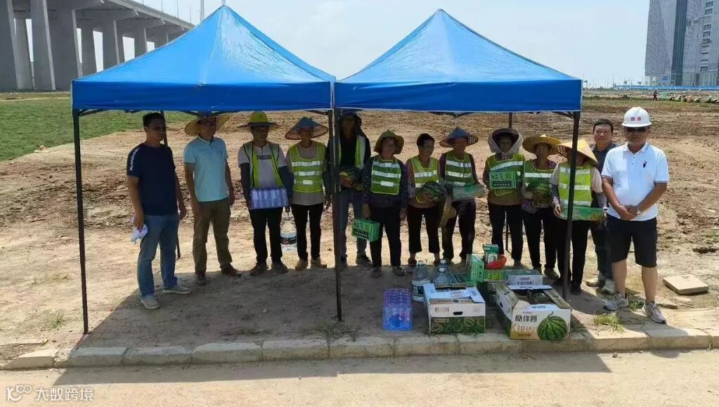 6月22日,为切实做好防暑降温工作,用实际行动关爱户外作业人员,围垦公司联合园林公司到深中通道登陆点E-35地块绿化提升项目开展“送清凉”慰问活动,为一线绿化工人送上西瓜、清凉饮料、纯净水、藿香正气水等防暑降温物资。