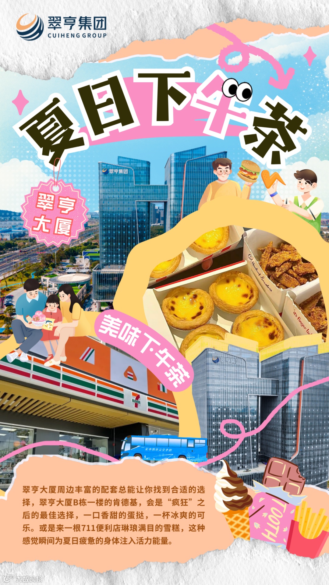16点,翠亨大厦周边丰富的配套总能让你找到合适的选择,翠亨大厦B栋一楼的肯德基,会是“疯狂”之后的最佳选择,一口香甜的蛋挞,一杯冰爽的可乐。或是来一根711便利店琳琅满目的雪糕,这种感觉瞬间为夏日疲惫的身体注入活力能量。