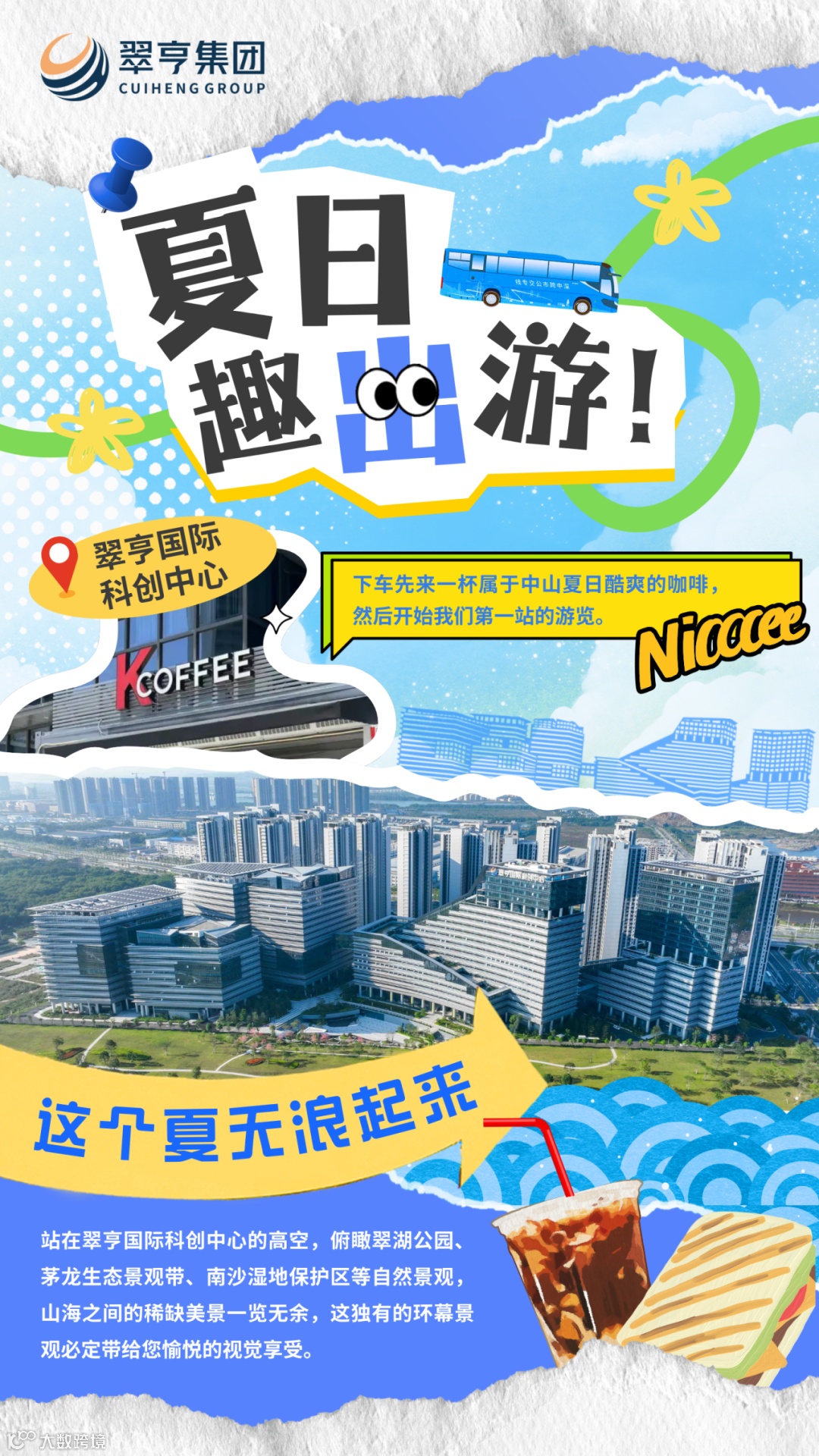 10点,巴士到达翠亨新区的翠亨国际科创中心。下车先来一杯属于中山夏日酷爽的咖啡,然后开始我们第一站的游览。站在翠亨国际科创中心的高空,俯瞰翠湖公园、茅龙生态景观带、南沙湿地保护区等自然景观,山海之间的稀缺美景一览无余,这独有的环幕景观必定带给您愉悦的视觉享受。