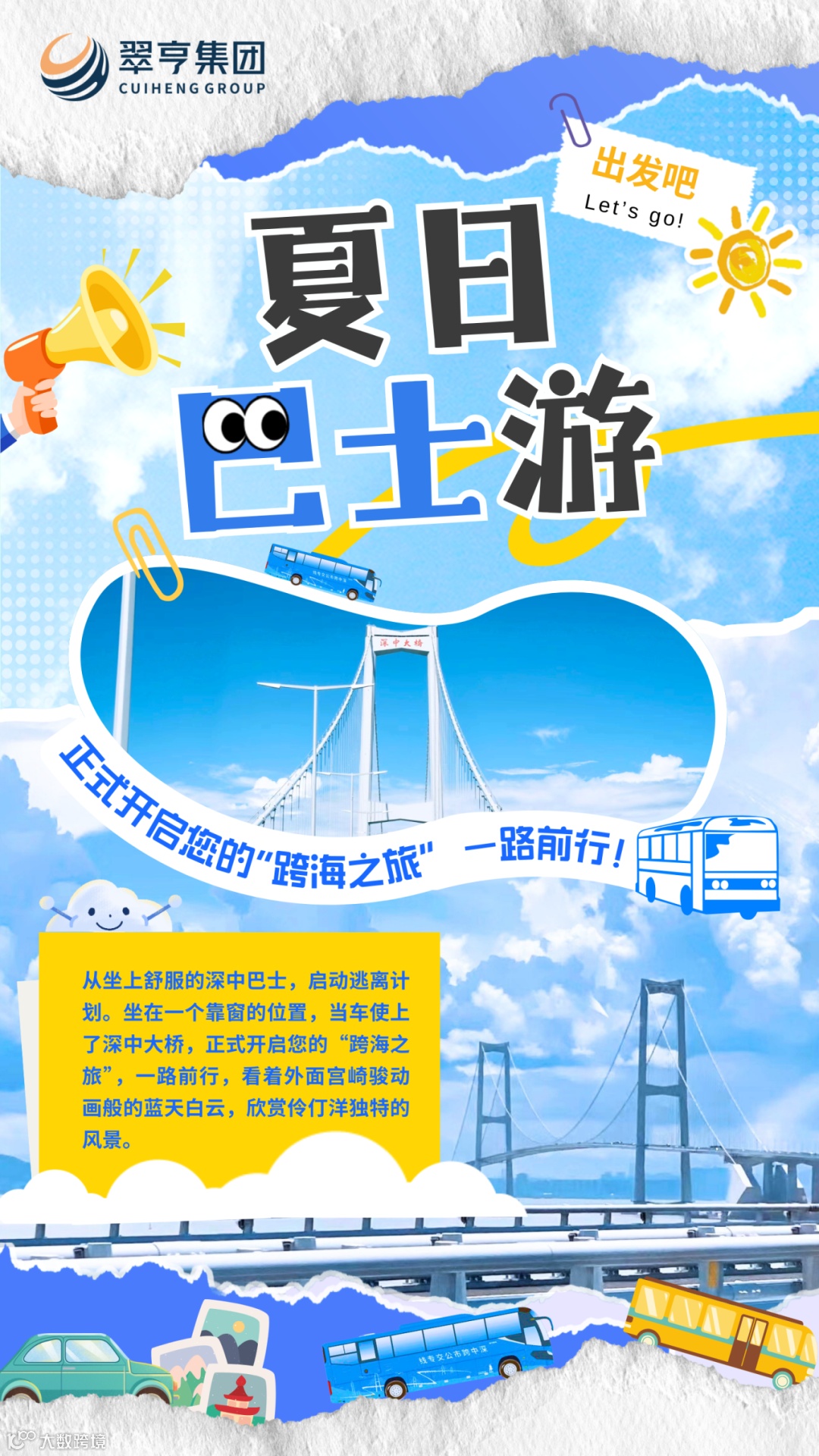 9点,坐上舒服的深中巴士,启动快乐计划。坐在一个靠窗的位置,当车驶上了深中大桥,正式开启您的“跨海之旅”,一路前行,看着外面宫崎骏动画般的蓝天白云,欣赏伶仃洋独特的风景。