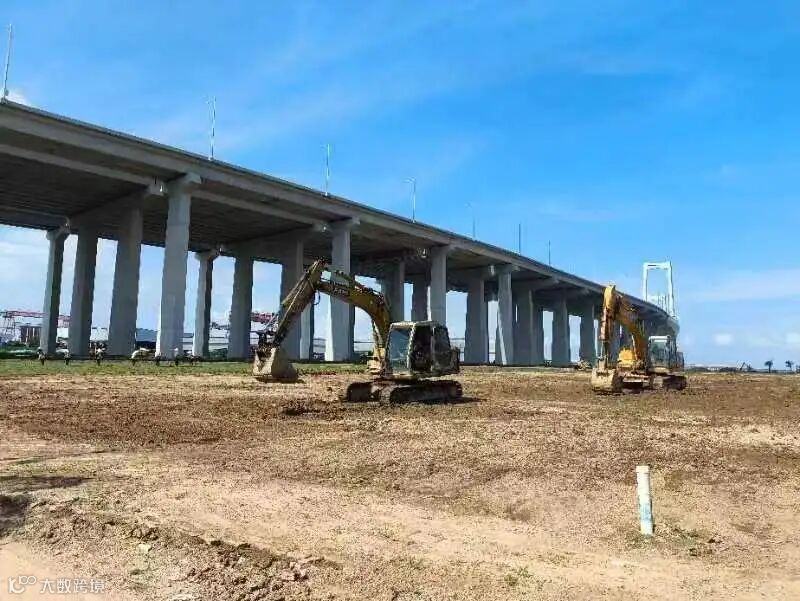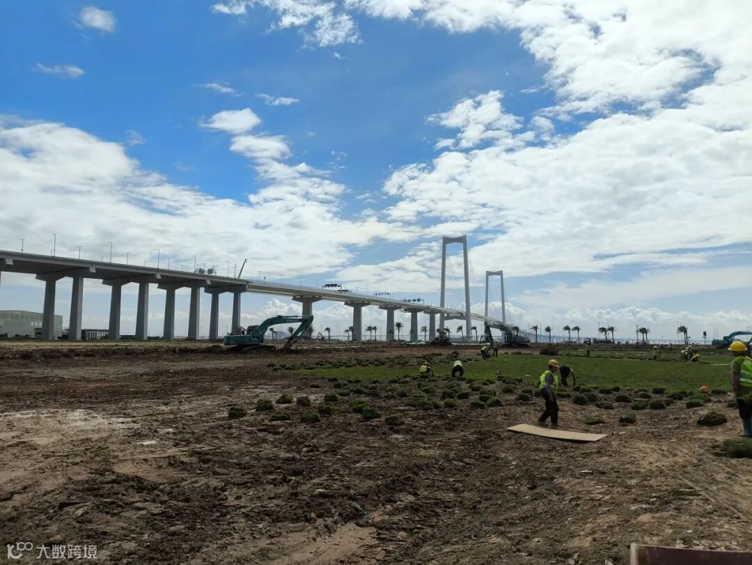 现在,在深中通道高速出口附近,挺拔而翠绿的乔木在疏朗草坪的衬托下,为桥体周边增添了生机盎然的自然气息。而去年这个时候,这里还是闲置待开发土地。