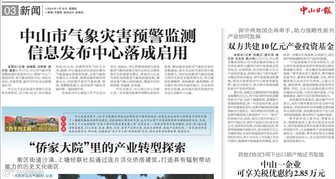 中山日报:共建10亿元发展基金!深中两地携手助力战略性新兴产业协同发展