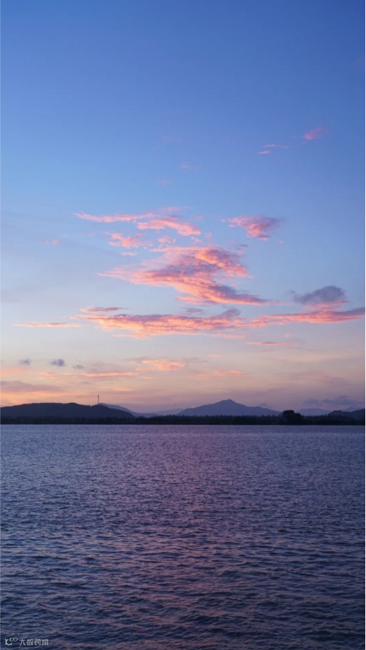 打卡一顷碧波之上的粉红晚霞