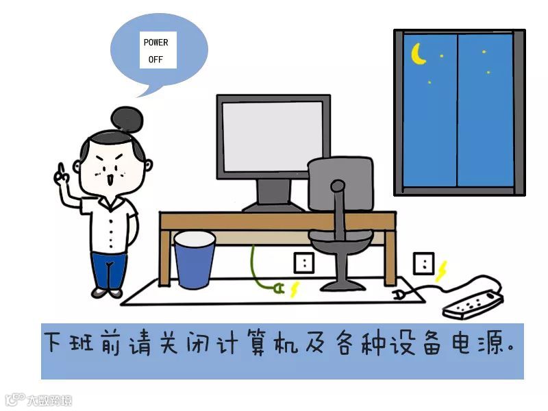 ◉ 离开办公室时,确保电器设备已全部关闭,不使用劣质电线,避免使用拖线板等延长电线。不在办公室内私自改装电器设备,不使用无合格证明的电器产品,不使用不符合规定的插座、充电器等电器设备。