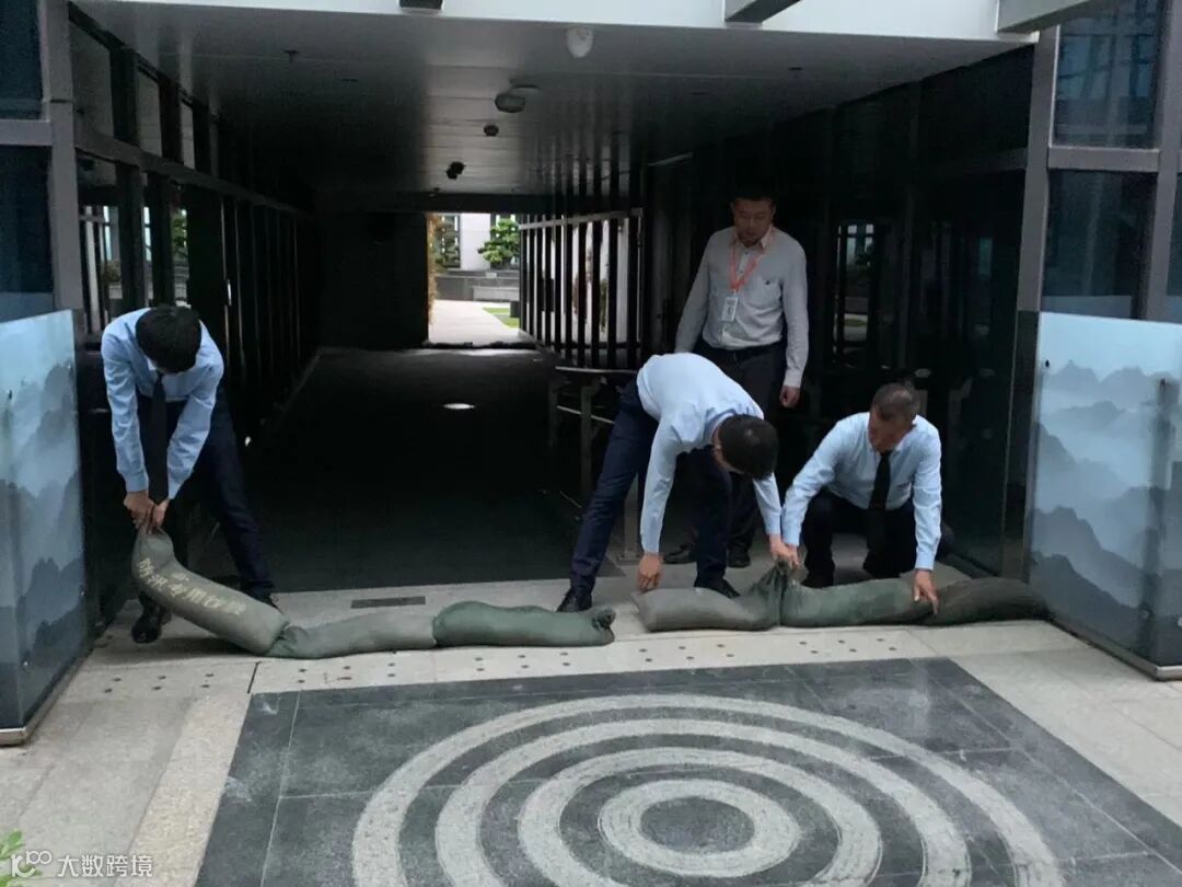 深中产服公司领导分组带队对仪器园、翠亨大厦进行防台风专项检查,检查防台风应急物资(防洪沙袋、防汛挡板等)的储备情况;测试地下车库抽水泵和移动水泵等排水设施设备状况。