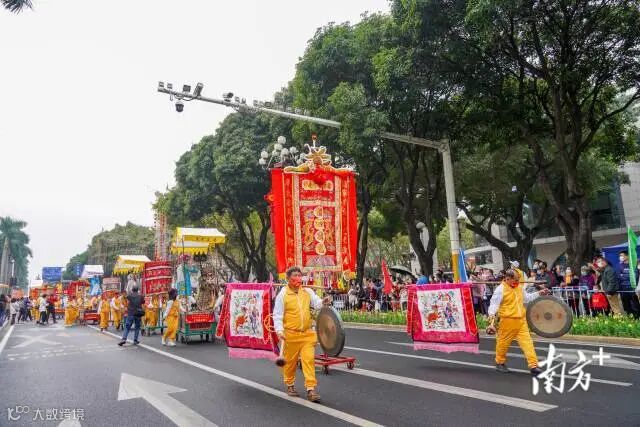 此外,中山市南朗街道工商业联合会(商会)方阵也亮相巡游,国家级非物质文化遗产项目南朗崖口飘色以及崖口板龙舞队伍加入民间艺术表演队伍中,为巡游方阵助阵表演,尽显新区特色。