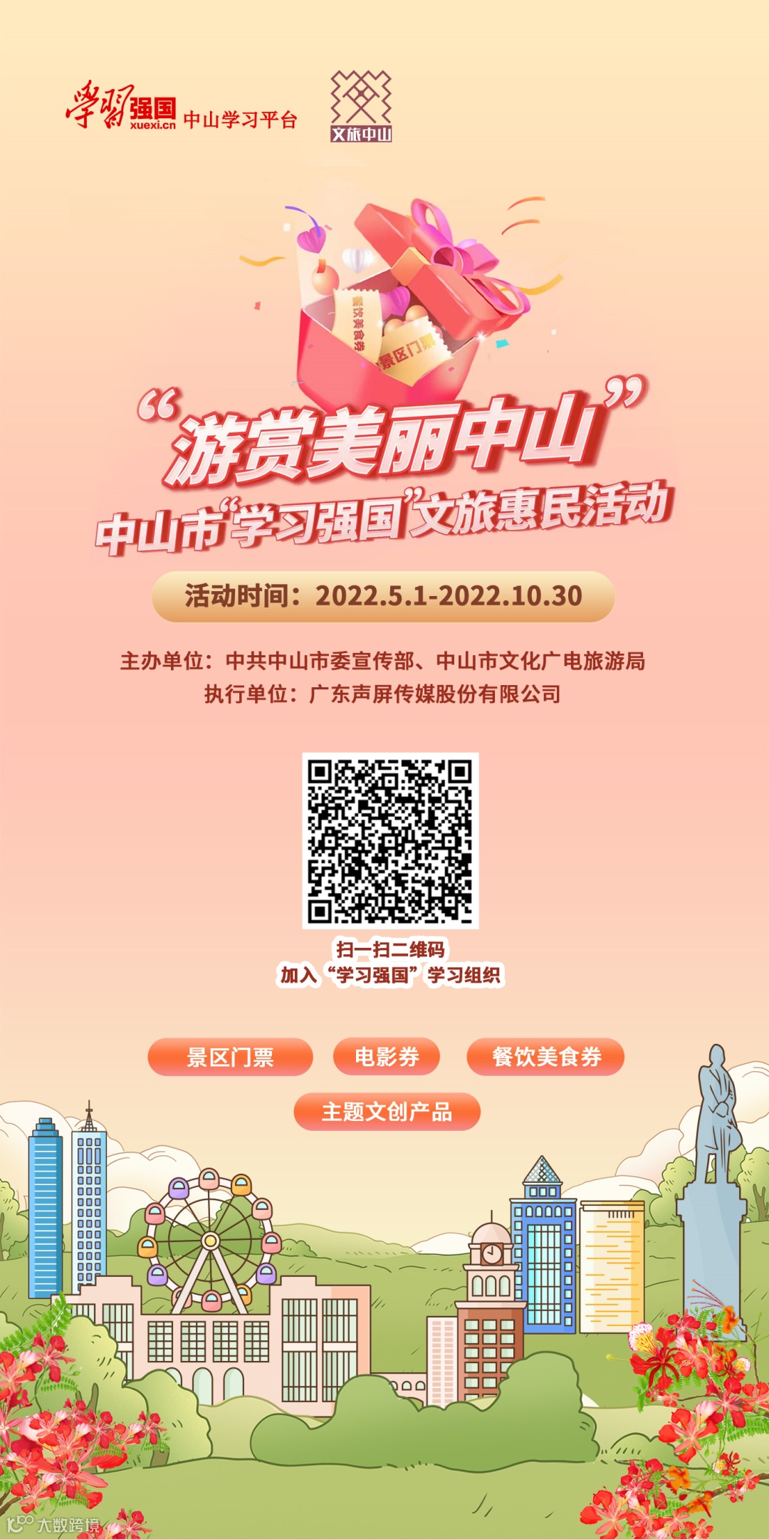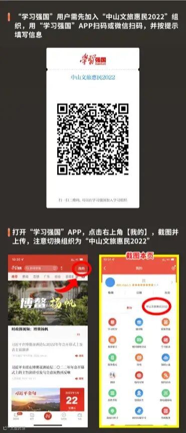 通过 中山发布、微理大义、文旅中山微信公众号服务栏进入活动首页。识别海报二维码加入“学习强国”学习组织。