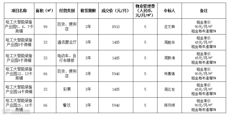 中山火炬开发区临海工业园开发有限公司于2021年4月26日-2021年5月11日就中山翠亨新区和欣路12号哈工大智能装备产业园商铺进行公开招租,并于2021年5月12日召开现场竞价会确定中标承租人,现就中标人结果公告5天。