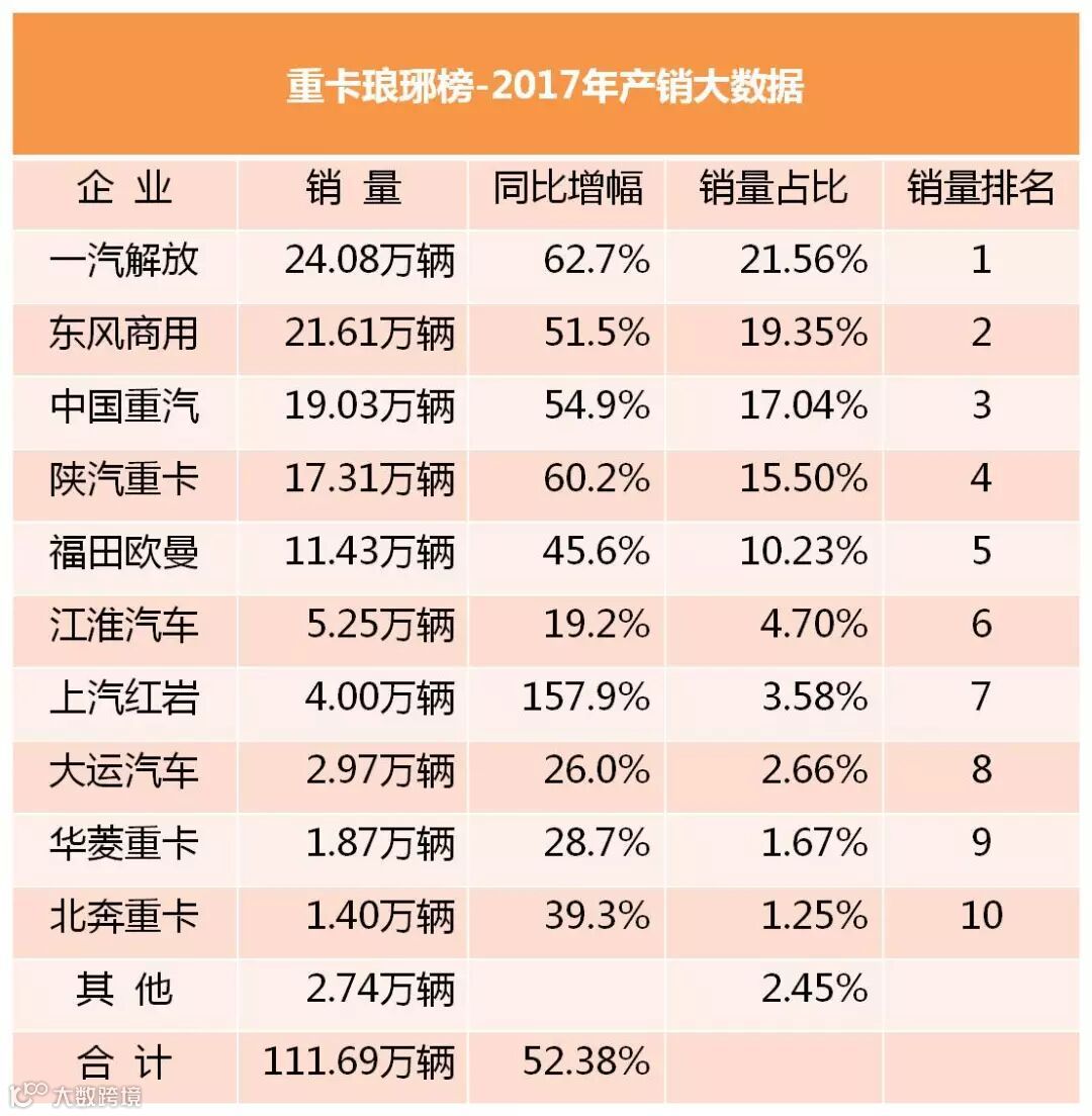 2017年,重卡产销114.97万辆和111.69万辆,同比增长55.07%和52.38%。最终,一汽解放摘得销量冠军,实现销量24.08万辆,同比增长62.7%;东风商用夺得销量亚军,实现销量21.61万辆,同比增长51.5%;中国重汽获得销量季军,实现销量19.03万辆,同比增长54.9%;陕西重卡排名第四,实现销量17.31万辆,同比增长60.2%;福田欧曼排名第五,实现销量11.43万辆,同比增幅45.6%。排名前五的车企对总销量贡献颇大,前五位车企销量占比高达83.68%,重卡市场可谓是“三国时代”,已呈现寡头竞争格局。