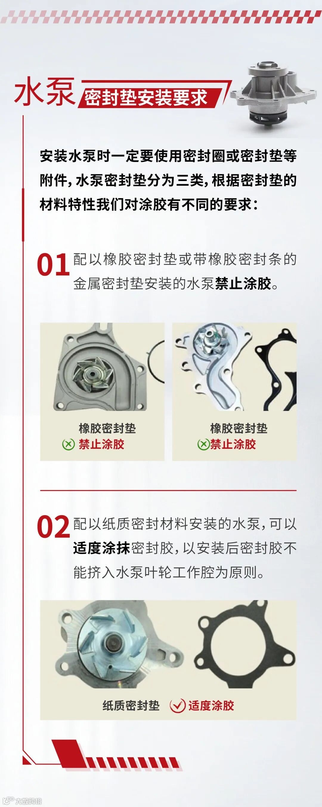 水泵只有纸垫可以适量打胶,金属垫和橡胶垫都不能用胶。橡胶垫用胶,密封胶会影响橡胶垫的性能,造成漏水。 金属垫或者橡胶垫打胶或者纸垫过量打胶,都容易把胶挤进水泵叶轮工作腔,容易影响到水封造成漏气,影响到节温器卡滞造成水温高,还容易进去细小的水道造成堵塞,造成循环不好,严重者直接伤害发动机。