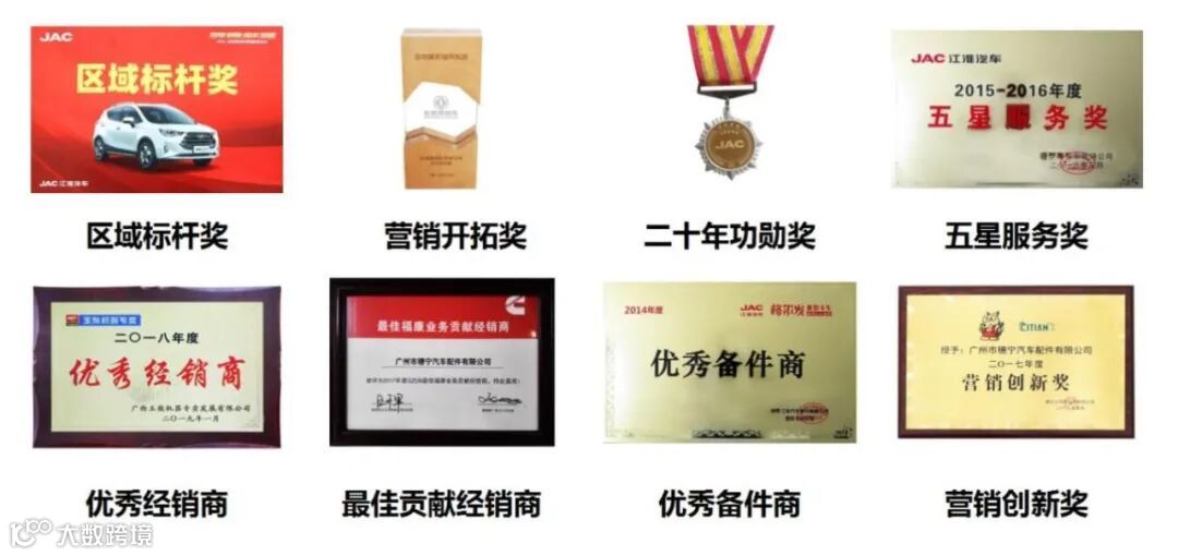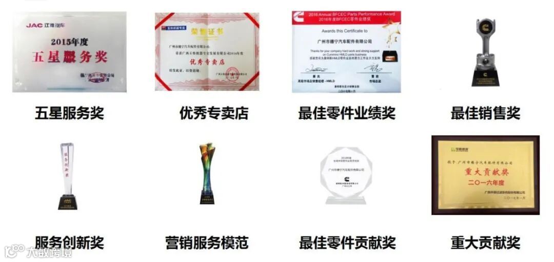 一分耕耘一分收获,多年来,穗宁人在平凡的岗位上创造了不平凡的业绩,赢得了广大合作伙伴的高度认可,并多次荣获江淮汽车“五星服务奖”、“重大贡献奖”、“优秀经销商”、“最佳营销创新奖”;东风商用“优秀经销商”、“最佳营销开拓奖”;康明斯(中国)“最佳车用市场零件及耗材销售奖”、“最佳车用市场零件业务贡献奖”、“最佳渠道开拓奖”;玉柴机器“优秀经销商”、“优秀专卖店”等众多荣誉。