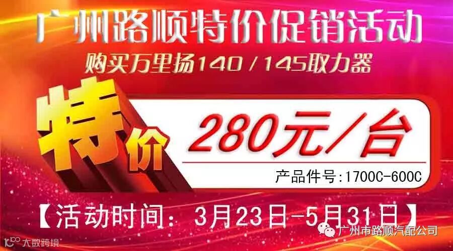 我公司(广州市路顺汽车配件有限公司)作为浙江万里扬变速器广东区域中心库,销量年年创新高。成绩的取得离不开广大顾客朋友们的鼎力支持。在此新春之际,我公司特地拿出一款产品做特价促销,以此馈赠新老客户。