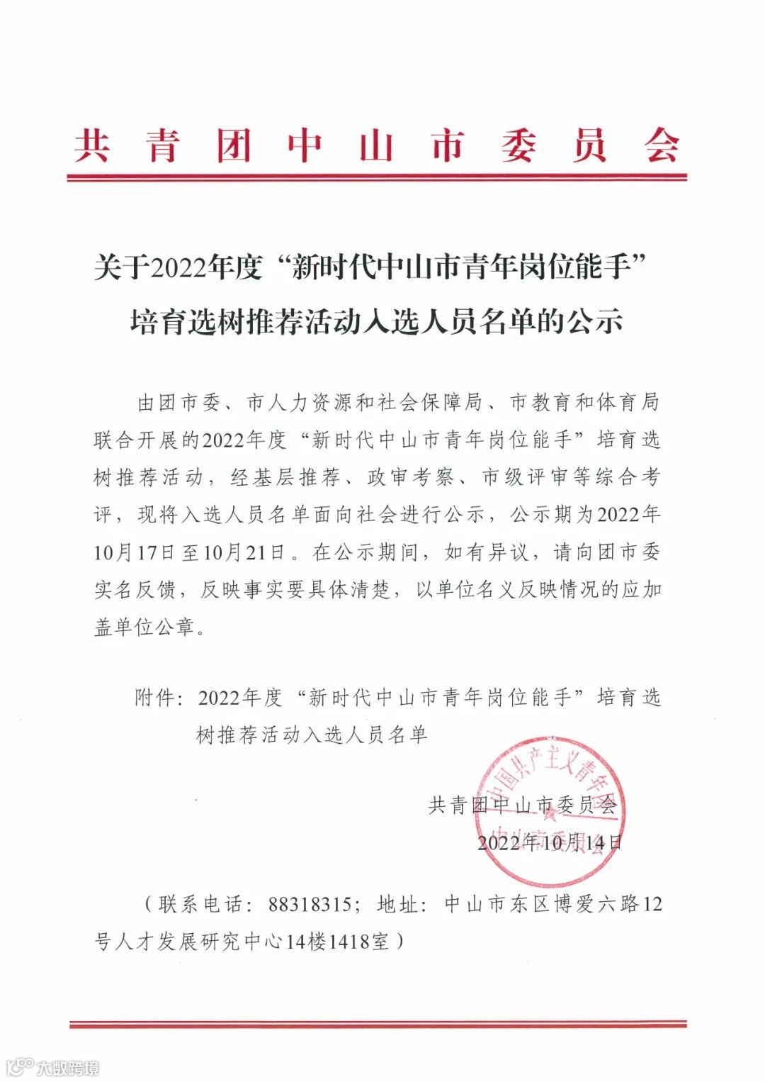 为充分发挥青年岗位能手模范带头作用,激励全市广大青年立足本职岗位、创先争优、努力成为行业骨干、青年先锋。近日,共青团中山市委员会发布了《关于表彰2022年度中山市“青年岗位能手”的决定》。